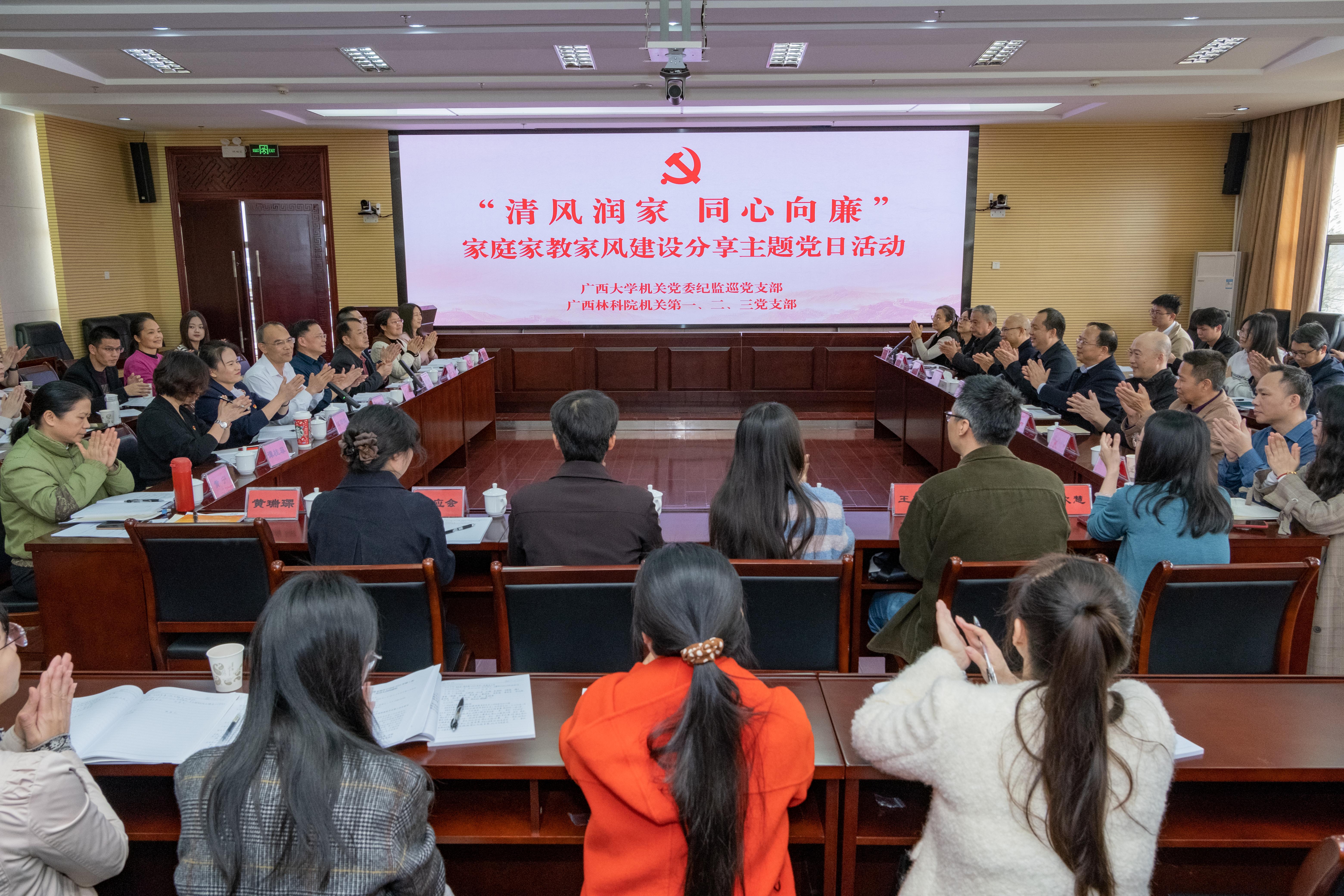 为团结引导党员干部发扬光大中华民族传统家庭美德,带头廉洁自律、以身作则,注重家庭家教家风建设,严格管好家人亲属、管好身边人身边事,助推爱国爱家、相亲相爱、向上向善、共建共享的社会主义家庭文明新风尚建设,1月19日,机关党委纪监巡党支部和广西林科院机关第一、二、三党支部联合开展“清风润家 同心向廉”廉洁家庭家教家风分享主题党日活动。